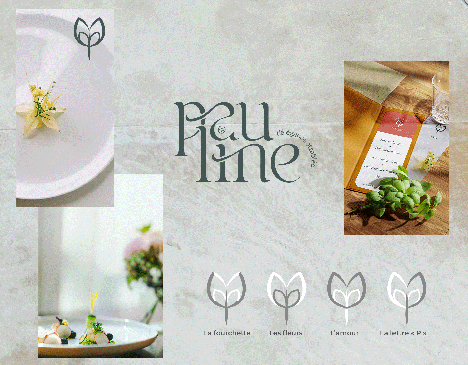 Pauline cuisine ses plats avec des fleurs qu’elle associe au gré des saisons. Ses mets sont d’une authenticité et d’une saveur particulière. Voilà quelques valeurs importantes qu’il est essentiel de retrouver à travers son identité visuelle.